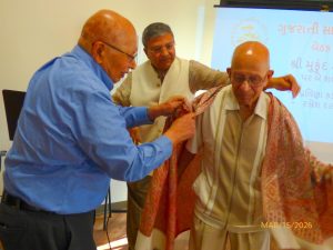 શ્રી ગૌરાંગભાઈએ પુષ્પગુચ્છથી અને શ્રી દીપકભાઈએ શાલ ઓઢાડી મુકુંદભાઈનુ બહુમાન કર્યું