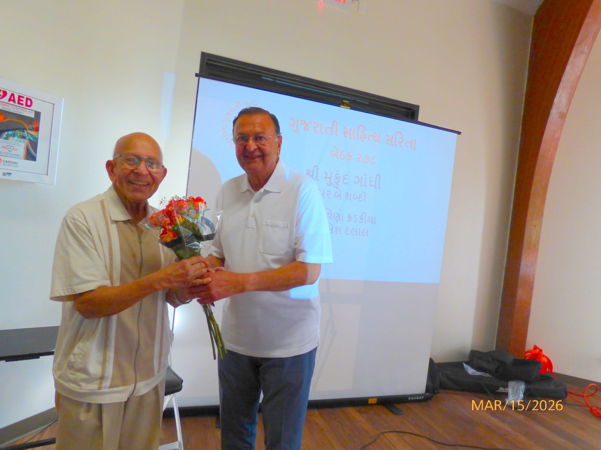 ગુજરાતી સાહિત્ય સરિતા, હ્યુસ્ટનની ૨૭૮મી બેઠક રવિવાર, માર્ચ ૧૫, ૨૦૨૬ ની બપોરે યોજવામાં આવી હતી. શ્રી નુરુદ્દીનભાઈ દરેડીયા અને શ્રી મુકુંદભાઈ ગાંધીનું બહુમાન કરવા ઉપરાંત શ્રી મુકુંદભાઈ ગાંધીના “રહસ્ય” વિષય પરના વક્તવ્ય અંગે આ સભા યોજાઈ હતી. તેમાં આશરે ૮૦ જેટલા મિત્રોની હાજરી રહી.