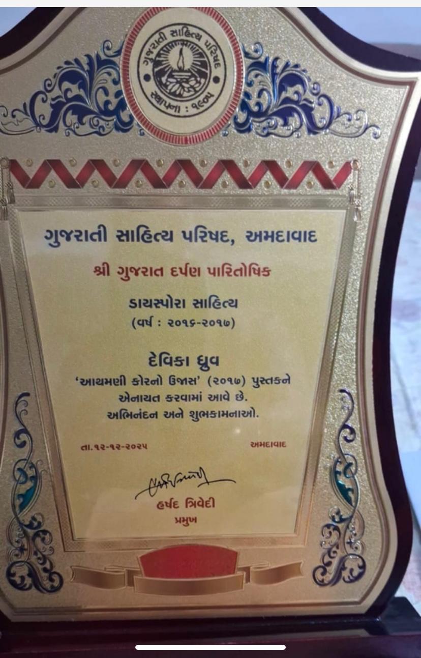 આખરે ૨૦૨૫માં, આ પારિતોષિકનું વિતરણ થયું. શ્રીમતી દેવિકા ધ્રુવની કલગીમાં એક નવું પીંછું ઉમેરાયું. આપણી ગુજરાતી સાહિત્ય સરિતા માટે આ ખૂબ જ આનંદ અને ગૌરવનો વિષય છે.